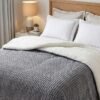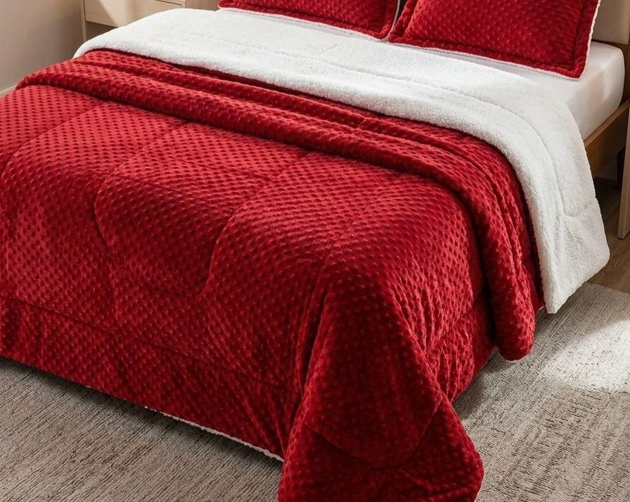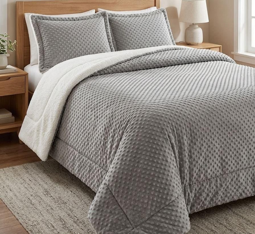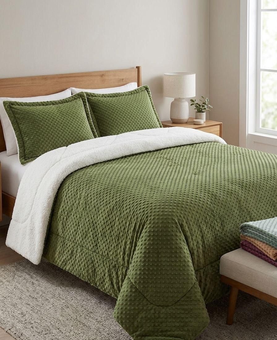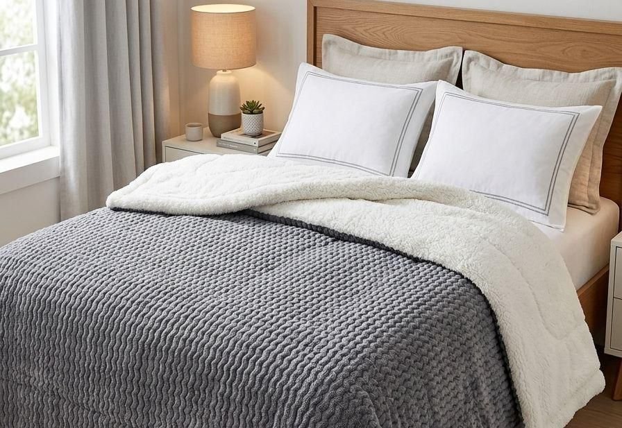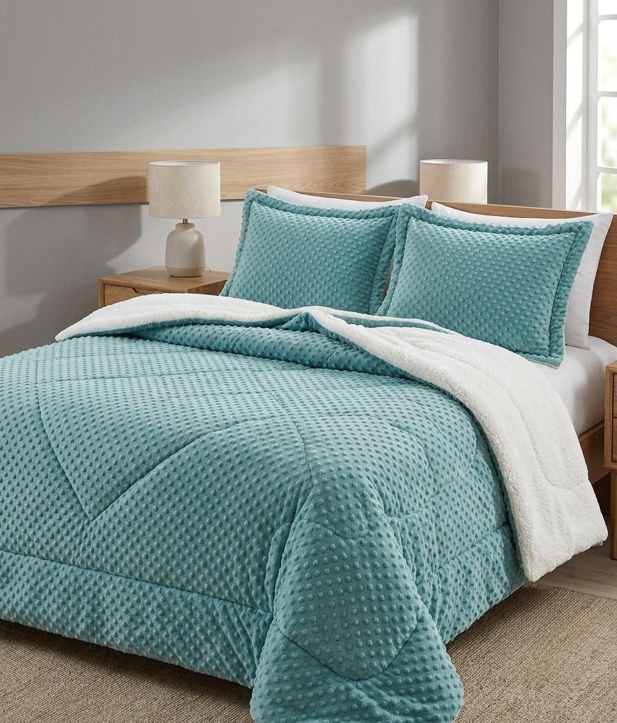 Coberdrom dupla face com acabamento premium e forro em sherpa estilo lã de carneiro, ideal para os dias frios. A face externa possui toque aveludado com textura moderna, enquanto o interior em sherpa mantém o calor e garante máximo conforto. Produto encorpado, macio e durável, perfeito para transformar o quarto com elegância e aconchego.